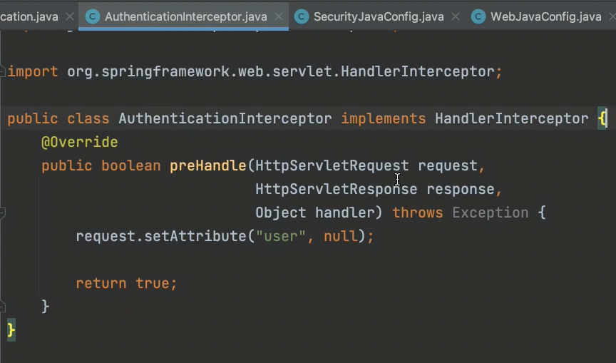 그래서 HandlerInterceptor를 implements한 AuthenticationInterceptor를 위와 같이 만들어주고!