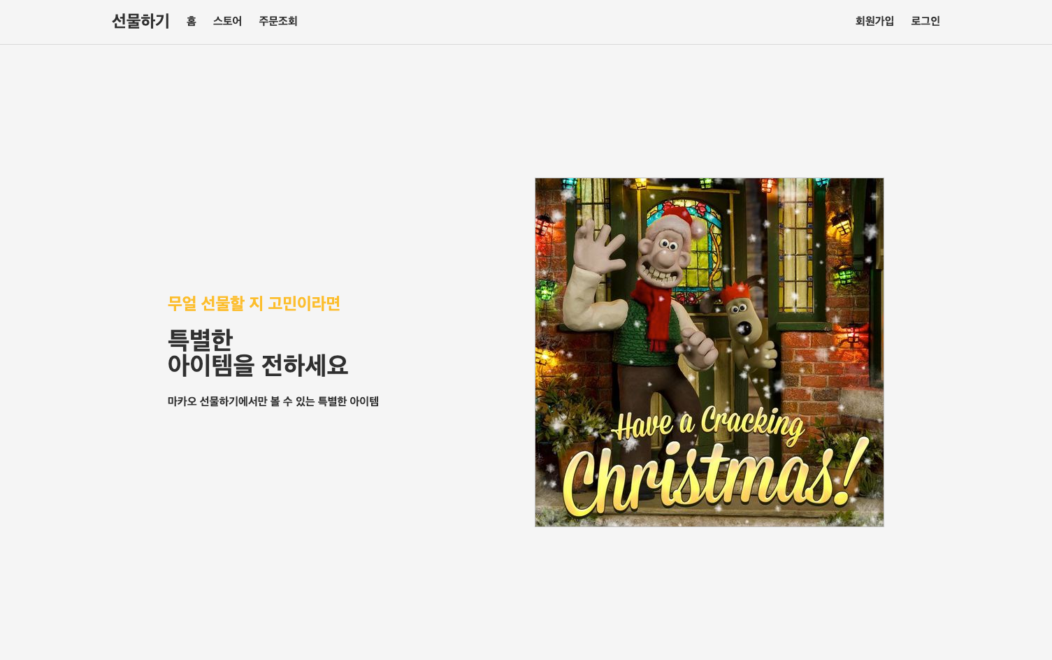 마카오톡 선물하기 메인 페이지 그러고 나서 바로 마크업 작업을 시작했는데, 사실 스타일링은 모든 로직이 구현이 된 후에 마지막으로 작업할 생각이었지만, 메인 페이지는 달라지는 화면이랄 것이 없는 데다가 헤더는 그냥 처음에 모습을 잡고 가면 좋을 거 같아 메인 페이지만 후딱 작업하였다. 히어로 이미지는 내가 좋아하는 월레스와 그로밋으로 ㅎㅎ 곧 크리스마스니까 그거에 맞는 사진으로 해봤다..ㅎ(CSS는 이런 소소한 재미가 있다!ㅋㅋㅋ)
