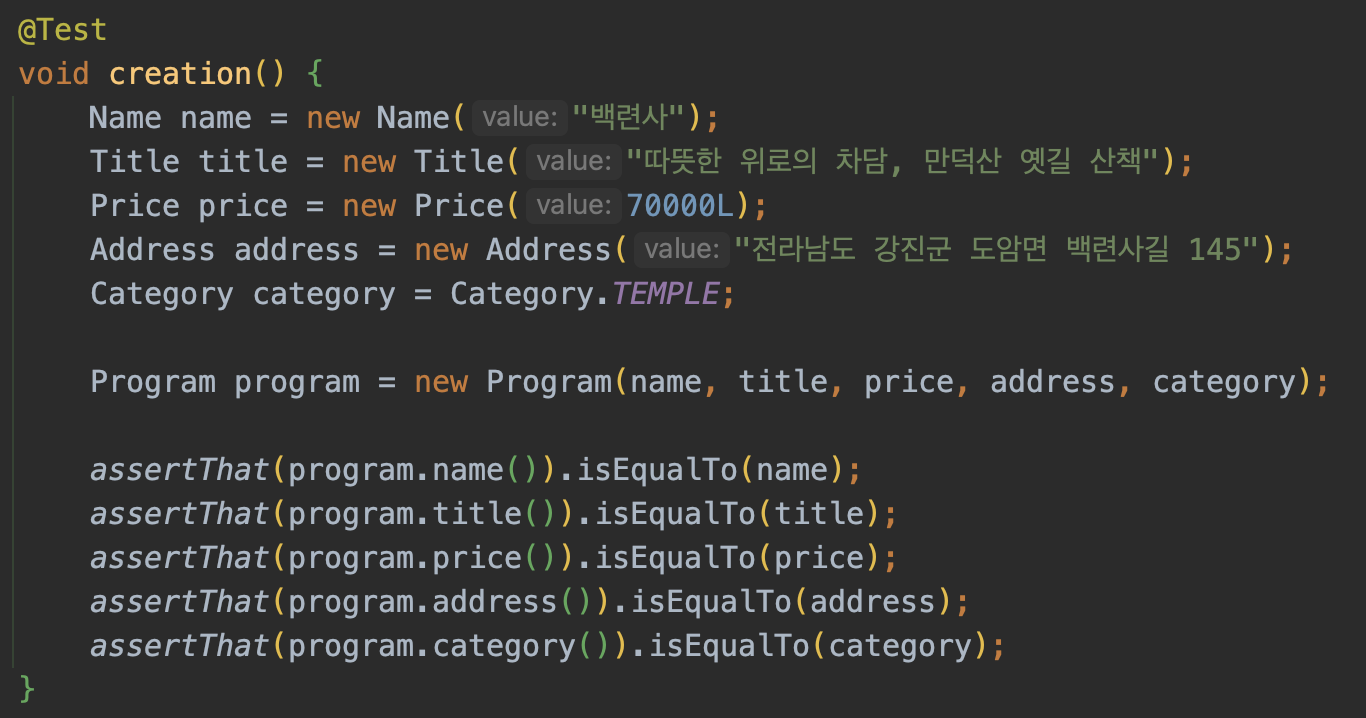 Value Object로 구성된 Program Entity 기존에 타입이 String name, String title, Long Price, String Address이던 시절과 달리 코드에서부터 이 콘텐츠가 어떤 것인지를 명확하게 알 수 있어 좋다.