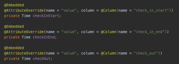 제공하는 서비스와 이용 규칙 그러고 나서 이용 규칙에 체크인과 체크아웃의 경우에도 Time이라는 Value Object를 만들어서 해당 타입을 사용하기로 하였는데, 정확하게 체크인 시작 시간(checkInStart), 체크인 끝나는 시간(checkInEnd), 체크아웃 시간(checkOut) 이렇게 총 3개의 컬럼이 필요했다. 그리하여 하나의 타입을 사용해서 DB에 저장되는 컬럼을 여러 번 새롭게 네이밍을 해줘야 했는데, 그러기 위해서 사용해야 하는 어노테이션이 @AttributeOverride였다. 역시나 ChatGPT에게 다시 설명을 요청했고, 대답은 아래와 같다.