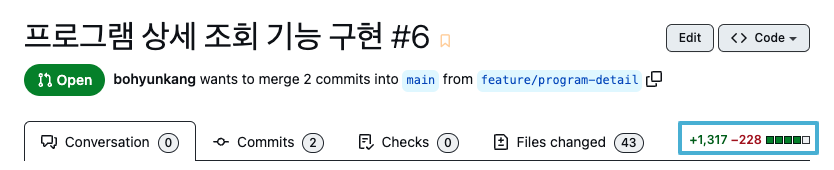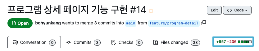 오늘 TIL의 제목이 왜 '세부 태스크 잘게 쪼개기'인가 하면.. 프로그램 상세 페이지 프론트/백 기능을 완성하고 PR을 날리니 생각보다 꽤 많은 양의 코드가 작성되어 있었기 때문이다.