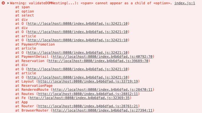 option 태그 안에서는 다른 태그를 사용할 수 없답니다... option 태그 내부에 다른 태그를 사용할 수 없어 생긴 에러였다. 이렇게 마크업을 했던 이유가 디자인 시안에서 텍스트가 왼쪽에는 '[신규회원] 웰컴쿠폰', 오른쪽에는 '-5,000원'이 정렬되어 있기 때문에, 레이아웃 스타일링을 위해서 두 텍스트를 각각의 span 태그로 나눠놨었다. 근데 이렇게 하면 안 된다는 것..! html 스펙을 찾아보니 option 태그 안에는 text만 들어갈 수 있다고 한다.