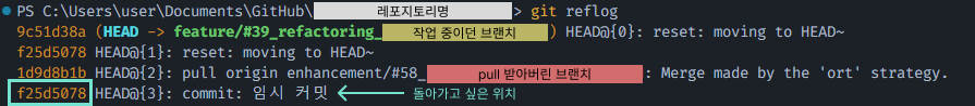 git reflog명령어를 실행하여 pull 받기 직전의 커밋 해시 확인.git reflog