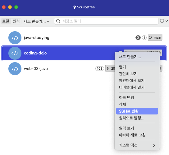 그동안 문제없었던 repository가 어쩌다 이렇게 된 건가? 하고 곰곰이 생각해보니 어제 Sourcetree에서 우클릭하고 '삭제'버튼을 누르려던 걸 모르고 SSH로 변환을 눌러버린 것! 사실 SSH로 변환하든, HTTPS로 변환하든 큰 문제는 없을 거라 생각해서 무시했었는데, 이거 때문인 걸 바로 깨닫고 수정하였다! 다음부터는 사소한 거 하나라도 지나치지 말자!💪